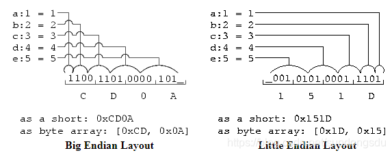 左图:对于大端来说,左侧为低地址,右侧为高地址。a为most significant, d为least significant