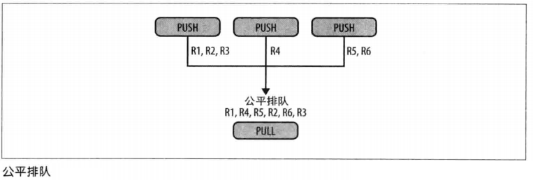 - 接收器的PULL套接字均匀地收集来自工人的结果。这就是所谓的公平排队(如下图所示)
