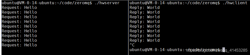 {// 1.创建上下文void *context = zmq_ctx_new();// 2.创建套接字、连接服务器void *requester = zmq_socket(context, ZMQ_REQ);zmq_connect(requester, "tcp://localhost:5555");int rc;// 3.循环发送数据、接收数据while(1){// 4.发送数据char *request = "Hello";rc = s_send(requester, request);assert(rc > 0);// 5.接收回复数据char *reply = s_recv(requester);assert(reply != NULL);printf("Reply: %s\n", reply);free(reply);}// 6.关闭套接字、销毁上下文zmq_close(requester);zmq_ctx_destroy(context);return 0;