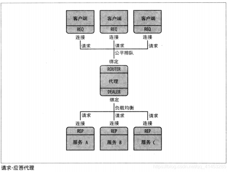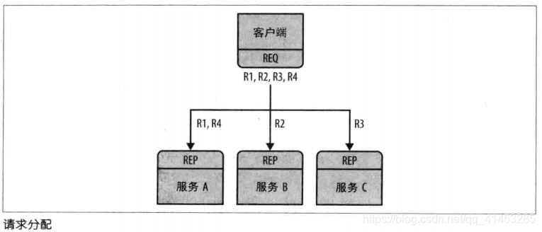 - 原理:一种是将每个客户端套接字连接到多个服务端点。REQ套接字随后会将请求发送到服务端上。比如说一个客户端连接了三个服务端点:A、B、C,之后发送请求R1、R4到服务A上,发送请求R2到服务B上、发送请求R3到服务C上(如下图所示)