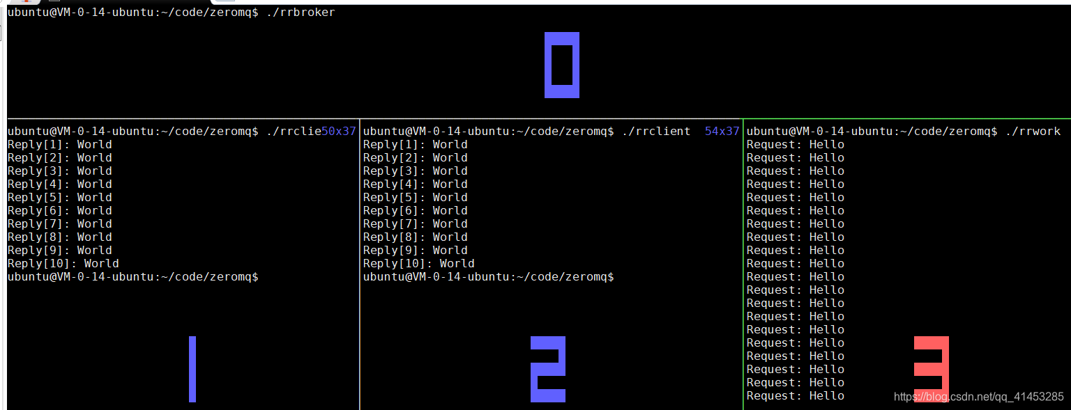- 下面运行两个客户端,0为代理,1、2为客户端,3位服务端。可以看到客户端的消息是有顺序到达客户端的,消息会自动进行排队