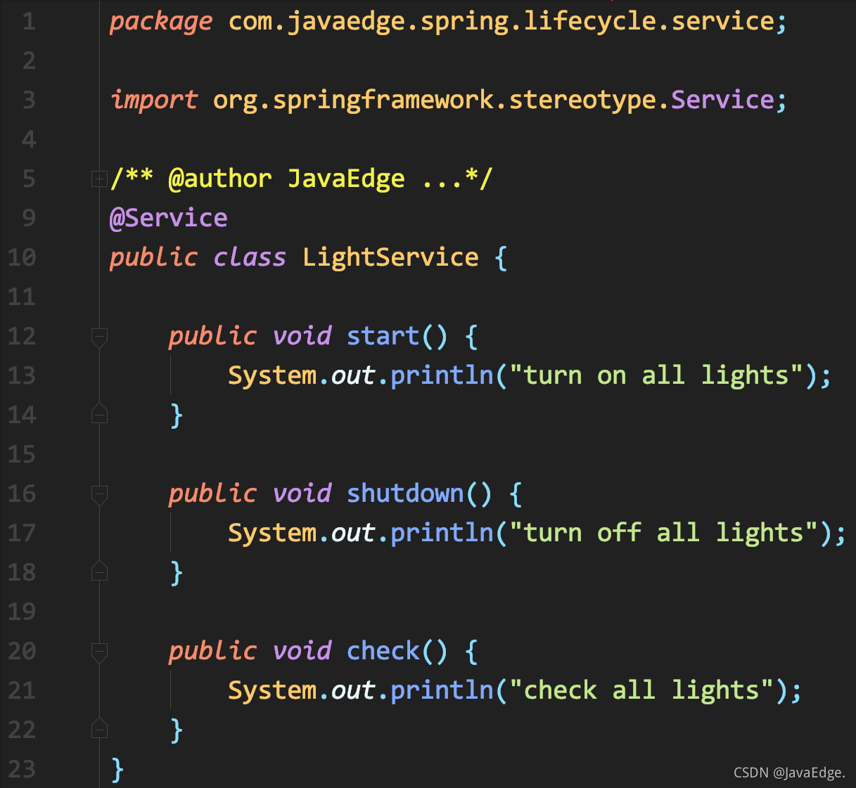 之前的案例中,若宿管系统重启,灯是不会被关闭的。但随着业务变化,可能会去掉 @Service ,而使用另外一种产生 Bean 的方式:创建一个配置类 BeanConfiguration(标记 @Configuration)来创建一堆 Bean,其中就包含了创建 LightService 类型的 Bean,并将其注册到 Spring 容器: