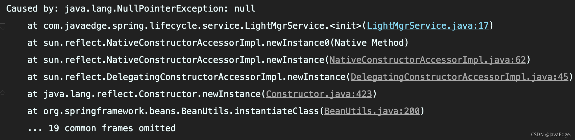 最终调用 ctor.newInstance() 实例化用户定制类LightMgrService,而默认构造器在类实例化时被自动调用,Spring 也无法控制。