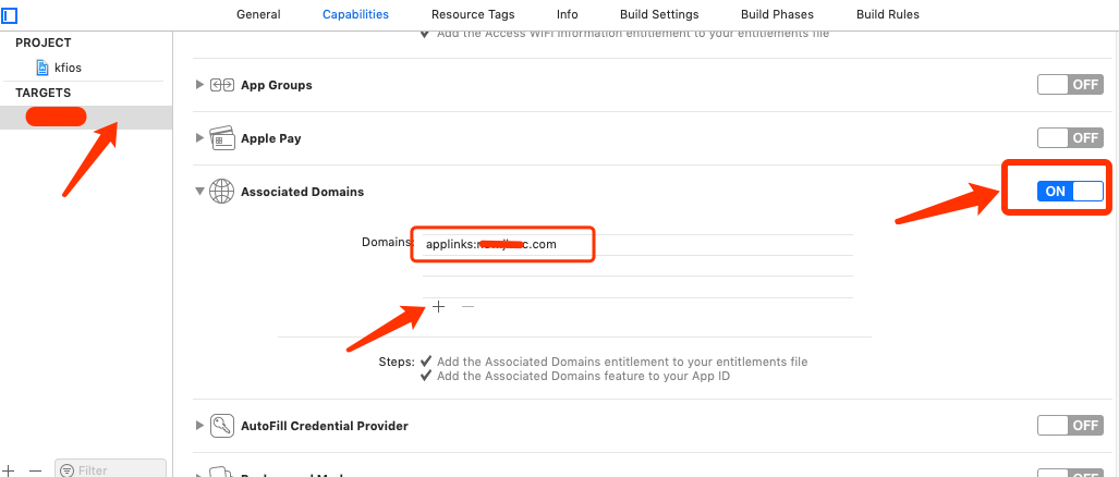 - 项目targets->Capabilities->开启Associated Domains、添加Domains(自己网站的域名)