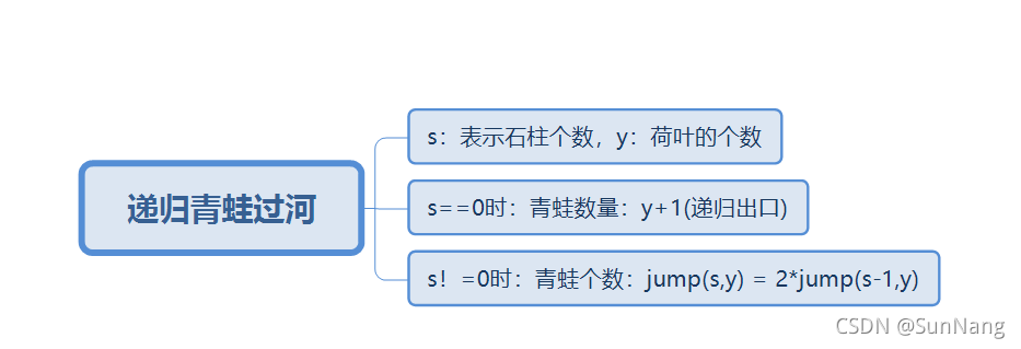 {if(s==0)//递归出口,当石柱个数等于0时 {return y+1;//青蛙个数==荷叶个数+1 }else{return 2*fun(s-1,y);//有石柱和荷叶的情况下满足:jump(s,y) == 2*jump(s-1,y) }