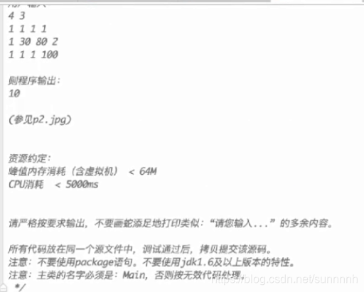 import java.util.Scanner;public class TestOne {static int[][] g;//输入的表格private static int n;//n行private static int m;//m列private static int minStep = Integer.MAX_VALUE; //存储最小格子数private static int total;//表格中的数据总和static int[][] vis;//访问标记。以访问的格子标记为1public static void main(String[] args) {Scanner sc = new Scanner(System.in);//1.输入行、列数(注意先输入列m)m = sc.nextInt();n = sc.nextInt();//2.输入表格中的数据g = new int[n][m];vis = new int[n][m];for(int i=0;i<n;i++) {for(int j=0;j<m;j++) {g[i][j] = sc.nextInt();//vis[i][j] = 0;total+=g[i][j];}}//3.对表格进行深度搜索,寻找满足条件的最少格子数dfs(0,0,0,0); //0行0列,已走格子数0,已走格子的累加和0//4.输出最小的步数System.out.println(minStep);}/*(1)对表格中的数据进行深度搜索* (i,j):开始访问的格子坐标* step:当前已访问的格子数目* sum:当前已访问的格子累加和* */private static void dfs(int i, int j, int step, int sum) {//1. i、j越界 或者 当前格子已访问 (不合法)if(i<0 || i==n ||j<0 || j==m || vis[i][j]==1) return;//2. 已将表格划分为元素和相等的两部分if(sum==total/2) {minStep = Math.min(minStep, step);return;}//3. 超过总元素和一半 (不合法)if(sum>total/2) { return;}vis[i][j] = 1; //访问g[i][j]dfs(i-1,j,step+1,sum+g[i][j]);//上dfs(i+1,j,step+1,sum+g[i][j]);//下dfs(i,j-1,step+1,sum+g[i][j]);//左dfs(i,j+1,step+1,sum+g[i][j]);//右vis[i][j] = 0; //回溯}}