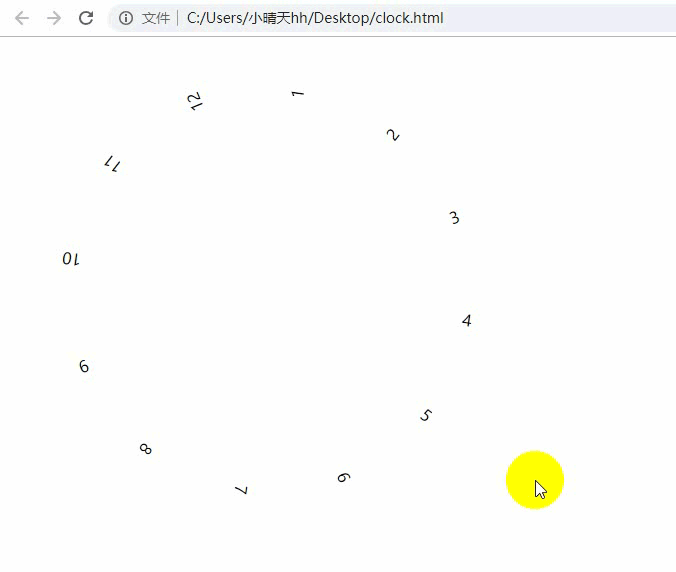<html><head><meta charset="utf-8"><title>时钟转动</title><style>.hours {position: absolute;padding: 0;width: 500px;height: 500px;}.h {position: absolute;}</style></head><body><div class="hours"><div class="h">1</div><div class="h">2</div><div class="h">3</div><div class="h">4</div><div class="h">5</div><div class="h">6</div><div class="h">7</div><div class="h">8</div><div class="h">9</div><div class="h">10</div><div class="h">11</div><div class="h">12</div></div><script>var hs = document.querySelectorAll(".hours .h");for (var i = 0; i < hs.length; i++) {hs[i].style.left = 250 + Math.cos(Math.PI / 180 * 30 * i) * 200 + "px";// hs[i]的x位置 = 300中心点+Math.cos(该元素所应该的弧度角)*200半径hs[i].style.top = 250 + Math.sin(Math.PI / 180 * 30 * i) * 200 + "px";hs[i].style.transform = `rotate(${30*i}deg)`;}var hours = document.querySelector(".hours");var inter = 0;setInterval(() => {inter += 1;hours.style.transform = `rotate(${inter}deg)`;}, 166.7)// 60s 转360°// 1 转6°</script></body>