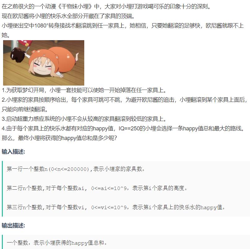本文主要是介绍吉首大学2019年程序设计竞赛(重现赛)B:干物妹小埋(树状数组求LIS),希望对大家解决编程问题提供一定的参考价值,需要的开发者们随着小编来一起学习吧!
