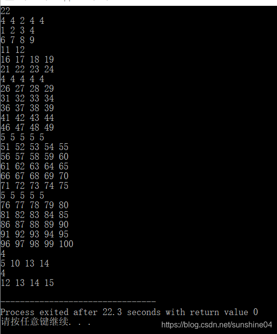 int main(){int a[20];//每排剩余座位数for(int i=0;i<20;++i)a[i]=5;//初始化为5int N;scanf("%d",&N);while(N--){int k;scanf("%d",&k);//读取需要几张车票int i=0;while(i<20&&a[i]<k)//查找是否有剩余座位数多于k的排++i;if(i<20){//有,从该排起始编号开始输出k个连续递增数字int start=i*5+6-a[i];for(int j=0;j<k;++j)printf("%d ",start+j);printf("\n");a[i]-=k;}else{//没有,从有剩余座位的排中输出空闲座位直至输出空余座位总数为kfor(int j=0;j<20&&k>0;++j)if(a[j]>0){int start=j*5+6-a[j];for(int m=0;m<min(a[j],k);++m)printf("%d ",start+m);k-=a[j];a[j]=k>a[j]?0:a[j]-k;}printf("\n");}}return 0;