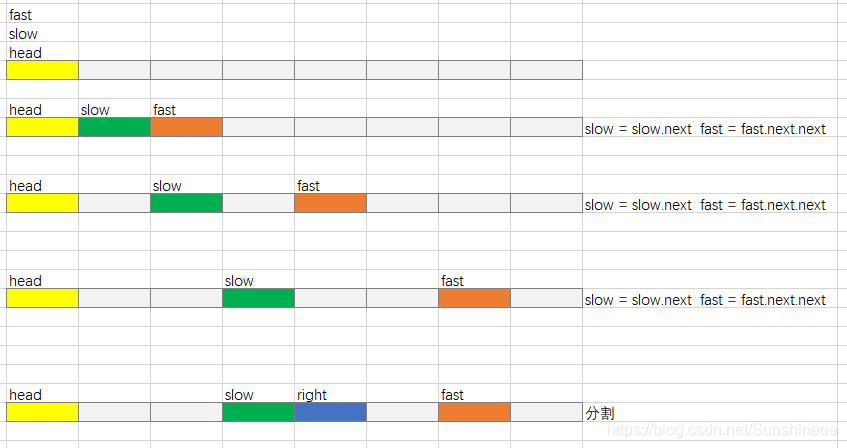 下面是分割,分成两个链表,一个是以head为头结点,另一个是以right为头结点的链表