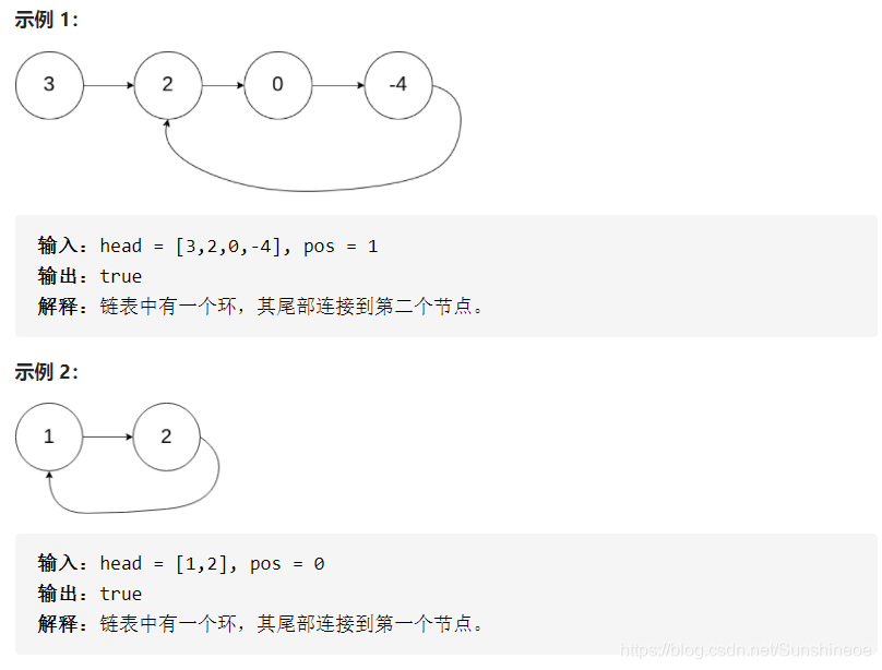如果链表中有某个节点,可以通过连续跟踪 next 指针再次到达,则链表中存在环。 为了表示给定链表中的环,我们使用整数 pos 来表示链表尾连接到链表中的位置(索引从 0 开始)。 如果 pos 是 -1,则在该链表中没有环。注意:pos 不作为参数进行传递,仅仅是为了标识链表的实际情况。