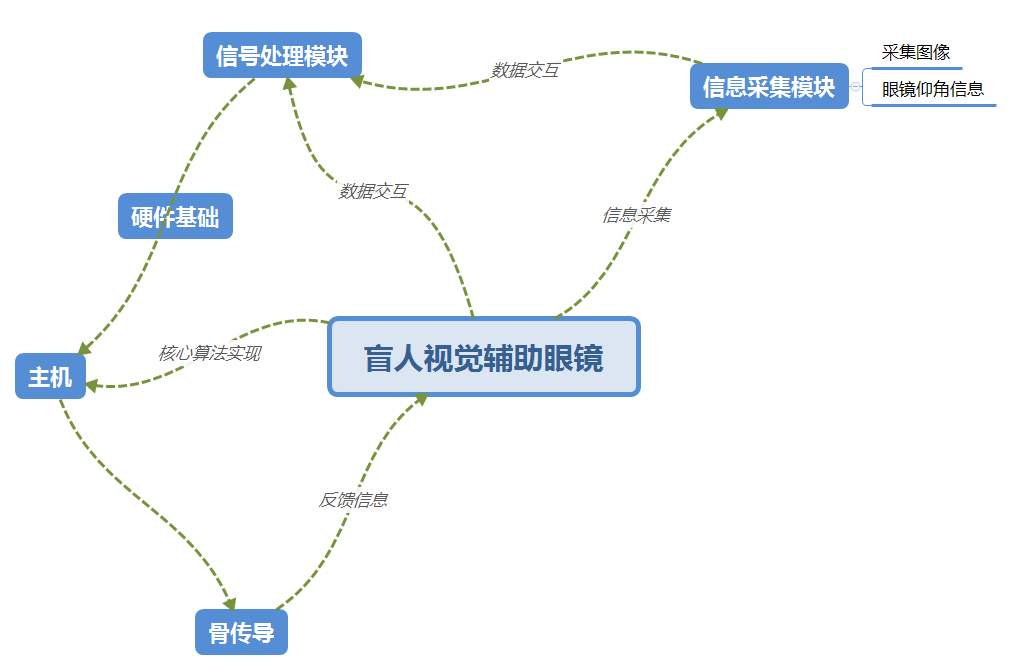 先大致介绍一下我的项目:项目名称是“盲人视觉辅助眼睛”。顾名思义,该眼镜的功能是辅助盲人行动。这是由信息采集设备、信息处理设备和信息反馈设备构成的系统。