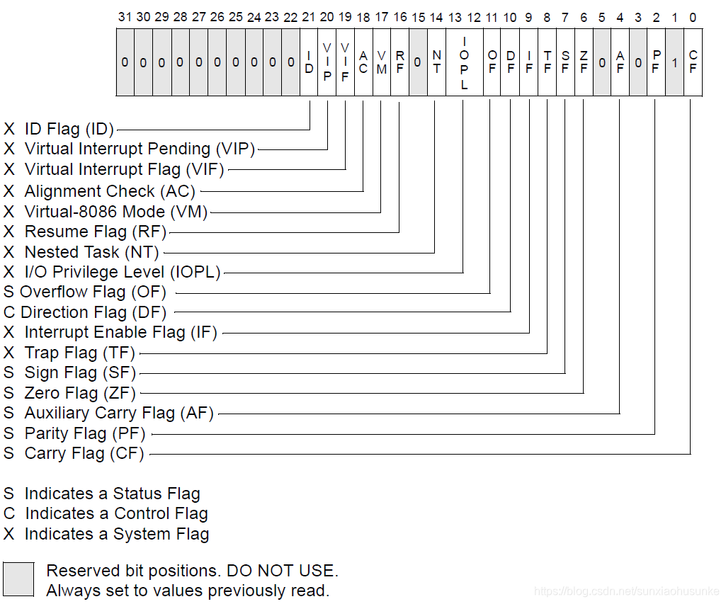 状态寄存器EFLAGS,包含一些状态标志、控制标志和系统标志。复位时,EFLAGS寄存器初值为0x00000002。