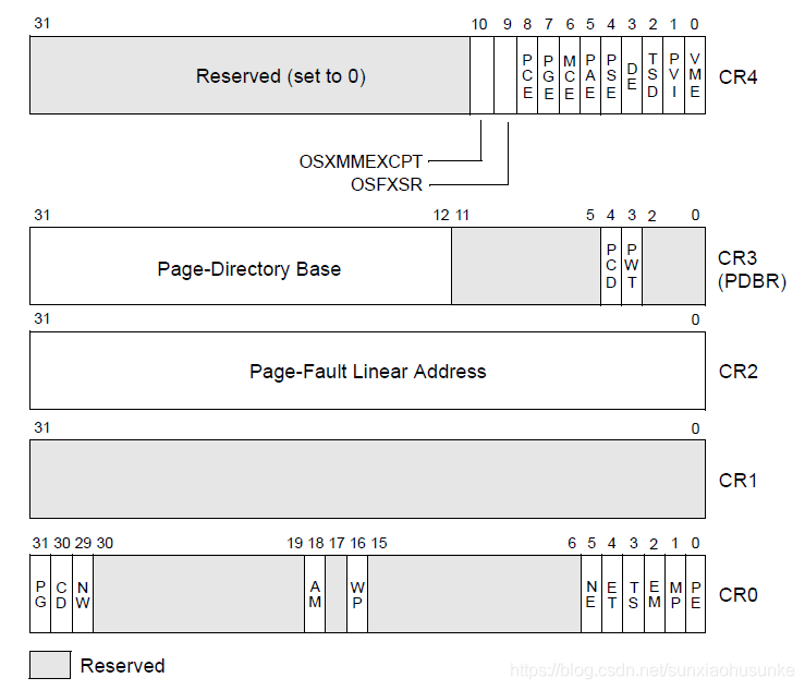 intel提供了CR0,CR1,CR2,CR3,CR4,用于操作处理器模式和当前执行任务的特性。