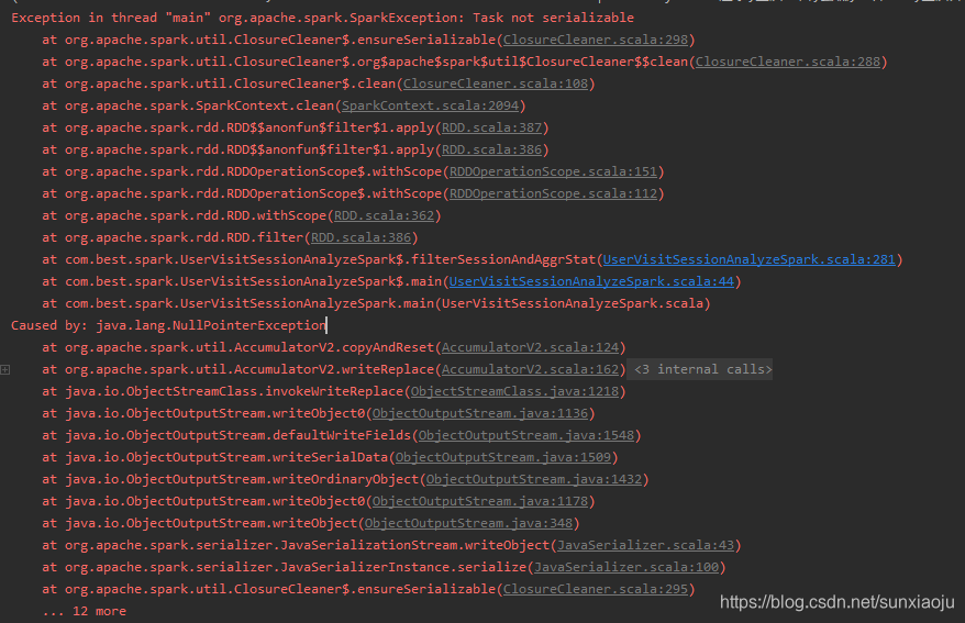 Exception in thread "main" org.apache.spark.SparkException: Task not serializableat org.apache.spark.util.ClosureCleaner$.ensureSerializable(ClosureCleaner.scala:298)at org.apache.spark.util.ClosureCleaner$.org$apache$spark$util$ClosureCleaner$$clean(ClosureCleaner.scala:288)at org.apache.spark.util.ClosureCleaner$.clean(ClosureCleaner.scala:108)at org.apache.spark.SparkContext.clean(SparkContext.scala:2094)at org.apache.spark.rdd.RDD$$anonfun$filter$1.apply(RDD.scala:387)at org.apache.spark.rdd.RDD$$anonfun$filter$1.apply(RDD.scala:386)at org.apache.spark.rdd.RDDOperationScope$.withScope(RDDOperationScope.scala:151)at org.apache.spark.rdd.RDDOperationScope$.withScope(RDDOperationScope.scala:112)at org.apache.spark.rdd.RDD.withScope(RDD.scala:362)at org.apache.spark.rdd.RDD.filter(RDD.scala:386)at com.best.spark.UserVisitSessionAnalyzeSpark$.filterSessionAndAggrStat(UserVisitSessionAnalyzeSpark.scala:281)at com.best.spark.UserVisitSessionAnalyzeSpark$.main(UserVisitSessionAnalyzeSpark.scala:44)at com.best.spark.UserVisitSessionAnalyzeSpark.main(UserVisitSessionAnalyzeSpark.scala)