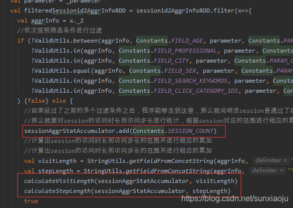 class SessionAggrStatAccumulator extends AccumulatorV2[String,String] with java.io.Serializable{private val serialVersionUID = 7292644531814797752Lvar resultInit: String = Constants.SESSION_COUNT + "=0|" + Constants.TIME_PERIOD_1s_3s + "=0|" + Constants.TIME_PERIOD_4s_6s + "=0|" + Constants.TIME_PERIOD_7s_9s + "=0|" + Constants.TIME_PERIOD_10s_30s + "=0|" + Constants.TIME_PERIOD_30s_60s + "=0|" + Constants.TIME_PERIOD_1m_3m + "=0|" + Constants.TIME_PERIOD_3m_10m + "=0|" + Constants.TIME_PERIOD_10m_30m + "=0|" + Constants.TIME_PERIOD_30m + "=0|" + Constants.STEP_PERIOD_1_3 + "=0|" + Constants.STEP_PERIOD_4_6 + "=0|" + Constants.STEP_PERIOD_7_9 + "=0|" + Constants.STEP_PERIOD_10_30 + "=0|" + Constants.STEP_PERIOD_30_60 + "=0|" + Constants.STEP_PERIOD_60 + "=0"var result: String = resultInit/*** 当AccumulatorV2中存在类似数据不存在这种问题时,是否结束程序。** @return*/override def isZero = false/*** 拷贝一个新的AccumulatorV2** @return*/override def copy: AccumulatorV2[String, String] = null/*** 重置AccumulatorV2中的数据*/override def reset(): Unit = {result = resultInit}/*** session统计计算逻辑* v就表示传过来的要累加的key** @param v*/override def add(v: String): Unit = {if (StringUtils.isNotEmpty(v) && StringUtils.isNotEmpty(result)) {val oldValue = StringUtils.getFieldFromConcatString(result, "\\|", v)if (oldValue != null) {val newValue = Integer.valueOf(oldValue) + 1result = StringUtils.setFieldInConcatString(result, "\\|", v, String.valueOf(newValue))}}}/*** 合并数据** @param other*/override def merge(other: AccumulatorV2[String, String]): Unit = {if (other.isZero) result = other.value}/*** AccumulatorV2对外访问的数据结果** @return*/override def value: String = result