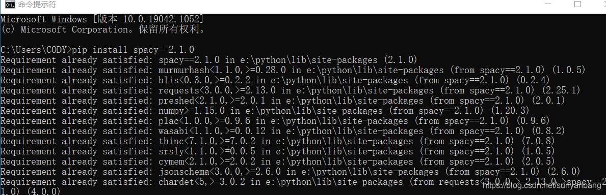 利用命令行输入:pip install spacy==2.1.0(默认pip工具已安装)