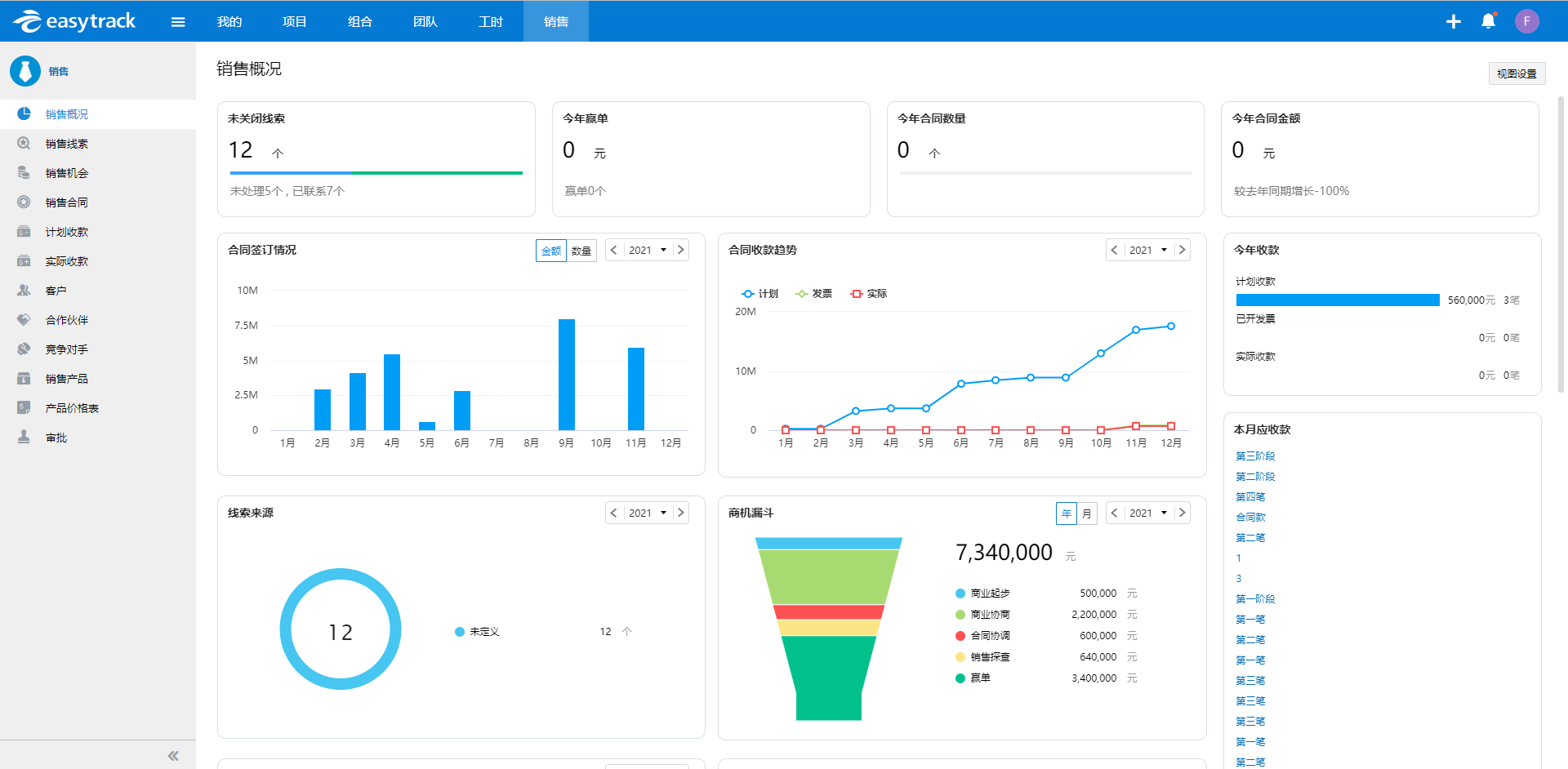 作为易趋PPM的销售管理应用组件,易趋CRM销售管理能够管理销售线索、商机、客户信息、销售合同、合同的计划付款和实际付款。管理人员能够在销售仪表盘从合同状态、金额、签订情况等各维度实时展示销售合同的整体状况,对项目销售状况了如指掌。