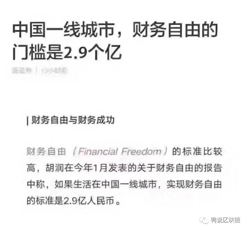 根据胡润1月发表的关于财务自由的报告显示,财务自由门槛比去年上涨50%,一线城市的门槛是2.9亿。