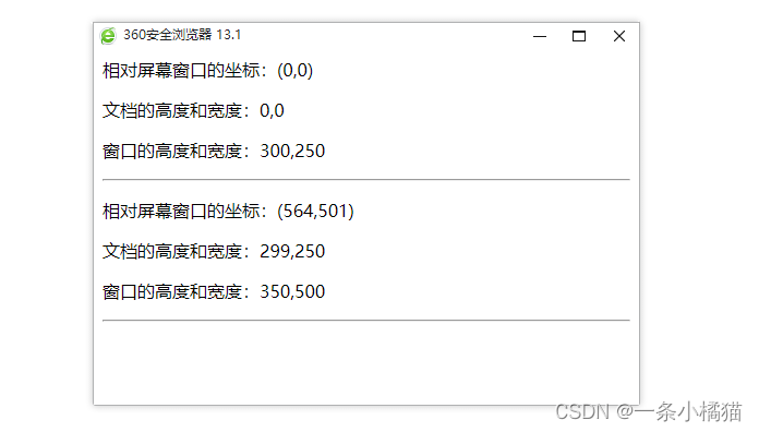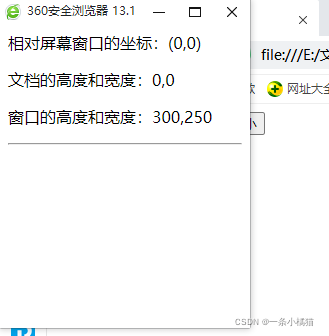<body><input type="button" value="打开窗口" onclick="openWin()"><input type="button" value="调整窗口位置和大小" onclick="changeWin()"><script>var myWindow;function openWin() {myWindow = window.open('', 'newWin', 'width=250,height=300');getPosSize(); // 获取窗口信息}function changeWin() {myWindow.moveBy(250, 250); // 将newWin窗口下移250像素,右移250像素myWindow.focus(); // 获取移动后newWin窗口的焦点myWindow.resizeTo(500, 350); // 修改newWin窗口的宽度为500,高度为350getPosSize(); // 获取窗口信息}function getPosSize() {// 获取相对于屏幕窗口的坐标var x = myWindow.screenLeft, y = myWindow.screenTop;// 获取窗口和文档的高度和宽度var inH = myWindow.innerHeight, inW = myWindow.innerWidth;var outH = myWindow.outerHeight, outW = myWindow.outerWidth;myWindow.document.write('<p>相对屏幕窗口的坐标:(' + x + ',' + y + ')</p>');myWindow.document.write('<p>文档的高度和宽度:' + inH + ',' + inW + '</p>');myWindow.document.write('<p>窗口的高度和宽度:' + outH + ',' + outW + '</p><hr>');}</script>