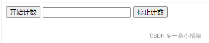 <body><input type="button" value="开始计数" onclick="startCount()"><input id="num" type="text"><input type="button" value="停止计数" onclick="stopCount()"><script>var timer = null, c = 0;function timedCount() { // 在文本框中显示数据document.getElementById('num').value = c;++c; // 显示数据加1}function startCount() { // 开始间歇调用timer = setInterval(timedCount, 1000);}function stopCount() { // 清除间歇调用clearInterval(timer);}</script>
