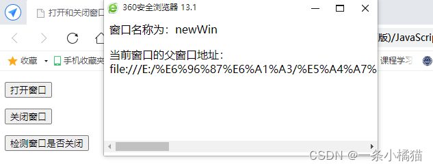 <body><p><input type="button" value="打开窗口" onclick="openWin()"></p><p><input type="button" value="关闭窗口" onclick="closeWin()"></p><p><input type="button" value="检测窗口是否关闭" onclick="checkWin()"></p><p id="msg"></p><script>var myWindow;function openWin() {myWindow = window.open('', 'newWin', 'width=400,height=200,left=200');myWindow.document.write('<p>窗口名称为:' + myWindow.name + '</p>');myWindow.document.write('<p>当前窗口的父窗口地址:' + window.parent.location + '</p>');}function closeWin() {myWindow.close();}function checkWin() {if (myWindow) {var str = myWindow.closed ? '窗口已关闭!' : '窗口未关闭!';} else {var str = '窗口没有被打开!';}document.getElementById('msg').innerHTML = str;}</script>