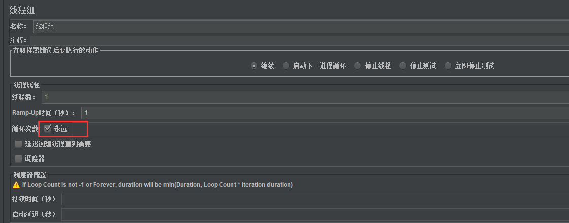 1)添加线程组,线程属性可以选择“永远”或根据实际测试进行配置,其它不用变