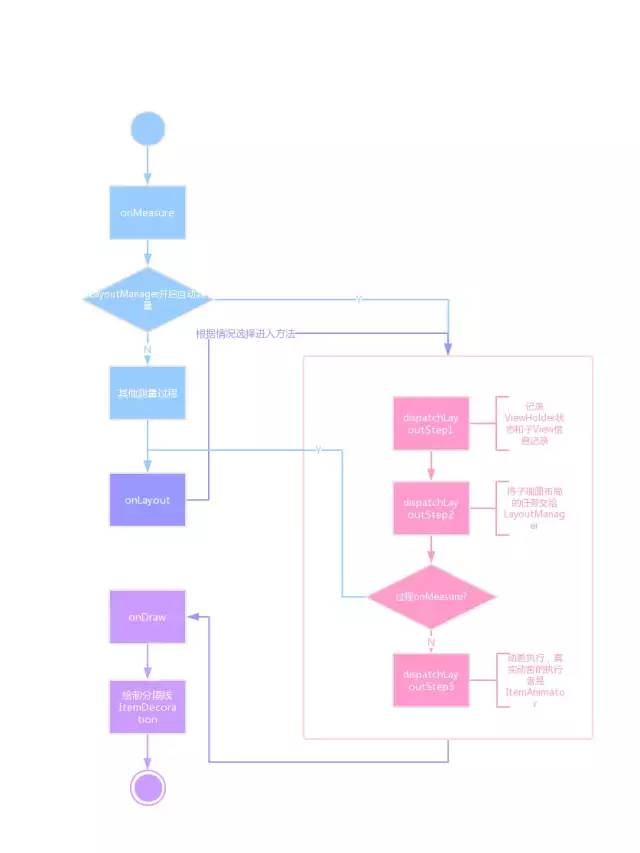 }void dispatchLayout() {if (this.mAdapter == null) {// ...} else if (this.mLayout == null) {// ...} else {this.mState.mIsMeasuring = false;// 根据当前State的不同执行不同的流程if (this.mState.mLayoutStep == STEP_START) {this.dispatchLayoutStep1();this.mLayout.setExactMeasureSpecsFrom(this);this.dispatchLayoutStep2();} else if (!this.mAdapterHelper.hasUpdates() && this.mLayout.getWidth() == this.getWidth() && this.mLayout.getHeight() == this.getHeight()) {this.mLayout.setExactMeasureSpecsFrom(this);} else {this.mLayout.setExactMeasureSpecsFrom(this);this.dispatchLayoutStep2();}this.dispatchLayoutStep3();}