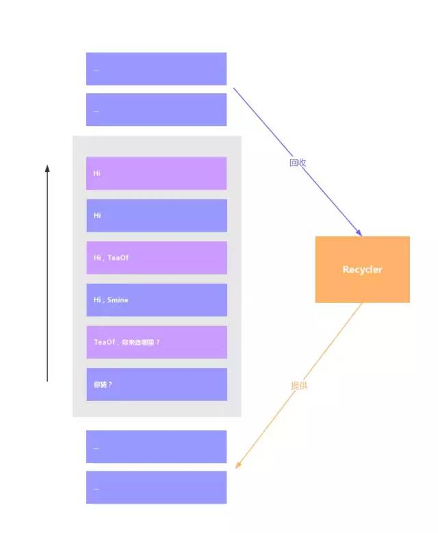 灰色的是小 T 同学的手机屏幕,查看聊天记录的时候,RecyclerView 不会每次都创建新的 ViewHolder,也不会一次性将所有的 ViewHolder 都建好,减少了内存和时间的损耗,所以,小 T 同学就可以流畅的查看和女友的上千条聊天记录了~