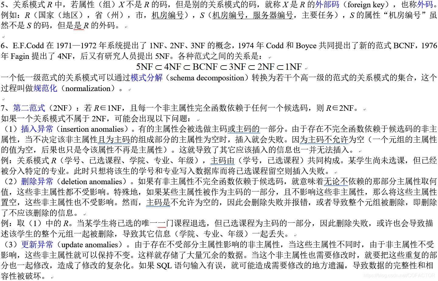 5、关系模式R中,若属性(组)X不是R的码,但是别的关系模式的码,就称X是R的外部码(foreign key),也称外码。例如:R(国家(地区),省(州),市,机房编号),S(机房编号,服务器编号,主要任务),S的属性“机房编号”虽然不是S的码,但是是R的外码。