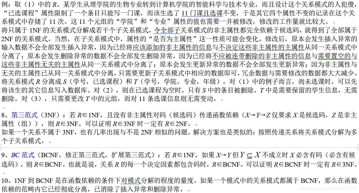 10、1NF到BCNF是在函数依赖的条件下对模式分解的程度的量度。如果一个模式中的关系模式都属于BCNF,那么在函数依赖的范畴内它已经彻底分离,已消除了插入异常和删除异常。