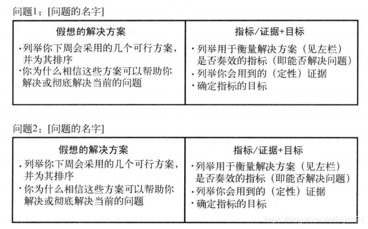 与精准创业画布相比,问题-解决方案画布要更为具体,重点关注的是某一特定时间段(一到两周)内的具体细节。