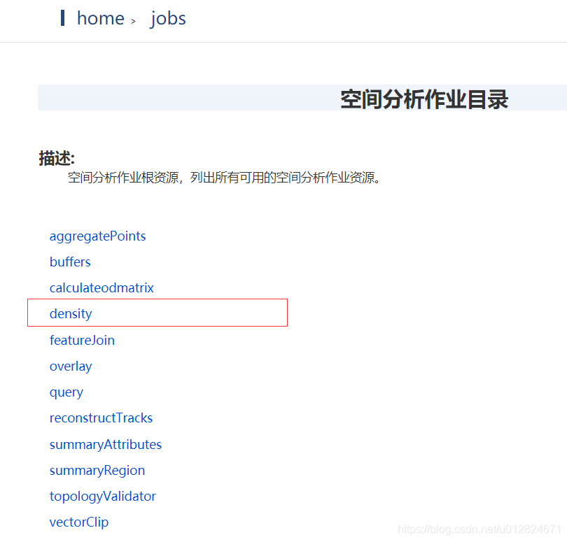 依次点击页面中的“distributeanalyst/rest” -> jobs -> spatialanalyst, 以下截图展示了所有支持的空间分析功能,