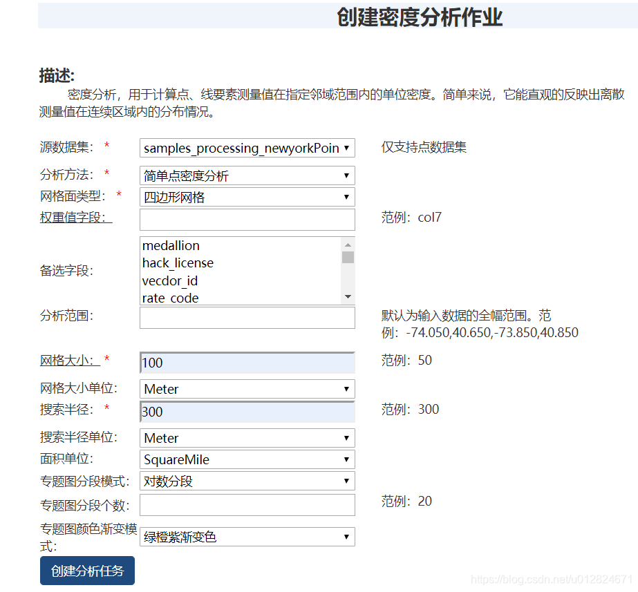 var kernelDensityJobParameter = new SuperMap.KernelDensityJobParameter({datasetName: "samples_newyork_taxi_2013-01_14k", // 分析的点数据集名称method: 0, // 分析方法:简单点密度分析: 0, 核密度分析: 1meshType: 0, // 网格面类型:四边形网格: 0, 六边形网格: 1fields: "col7,col8", // 权重字段query: new SuperMap.Bounds(-74.150, 40.550, -73.750, 40.950), // 分析范围resolution: 80, // 网格大小radius: 300, // 搜索半径meshSizeUnit: "Meter", // 网格大小单位radiusUnit: "Meter", // 搜索半径单位areaUnit: "SquareMile" // 面积单位