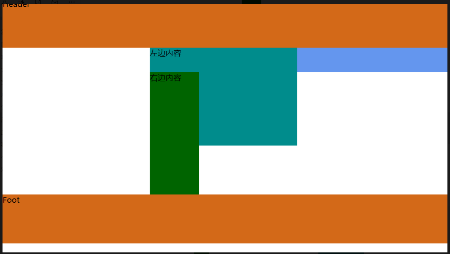 body{padding: 0;margin: 0;}.header,.foot{width: 100%;background-color: chocolate;height: 100px;}#main {background-color: cornflowerblue;height: 50px;width:100%;}#left {background-color: darkcyan;height: 200px;width: 300px;}#right {background-color: darkgreen;height: 250px;width: 100px;}