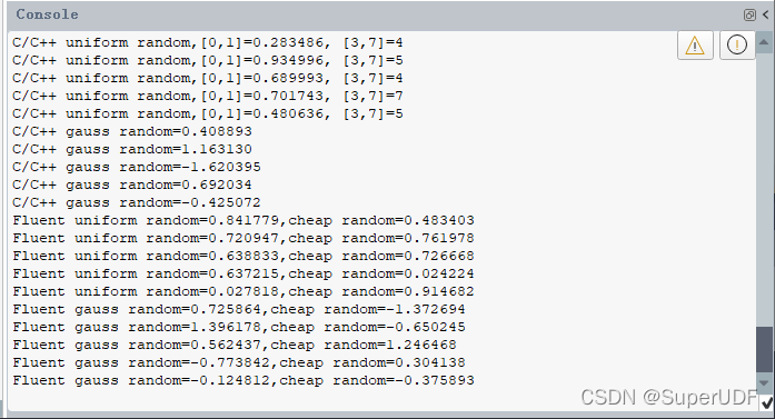 //fluent中定义的高斯随机函数Message("Fluent gauss random=%f,cheap random=%f\n", gauss_random(), cheap_gauss_random());}