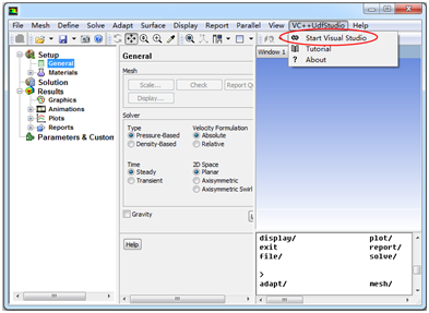 3. 双击桌面图标,选择需要版本后会自动启动Fluent,读入case后点击Fluent嵌入菜单中的“Start Visual Studio”子菜单.