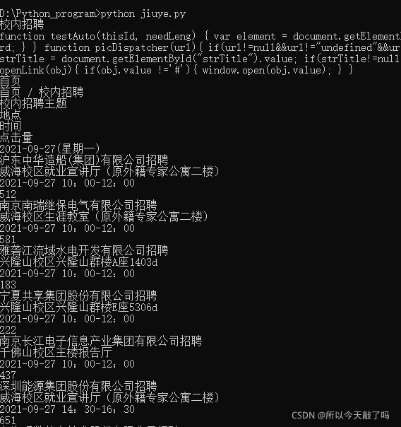 r = session.get(url)def get_text_link_from_sel(sel):mylist = []results = r.html.find(sel)i = 1for result in results:mytext = str(i)+result.text.replace('招聘','')if '已取消' in mytext:continueeigenvalue = str(result)eigenvalue_list = eigenvalue.split("'")mylink = 'https://jobcareer.sdu.edu.cn/eweb/jygl/index.so?modcode=jygl_xjhxxck&subsyscode=zpfw&rklx=jyw&type=ssoXnzpView&id='+ eigenvalue_list[-4]mylist.append((mytext, mylink))i = i+1return mylistdf = pd.DataFrame(get_text_link_from_sel('#zpeverday > li > div:nth-child(1) > a'))