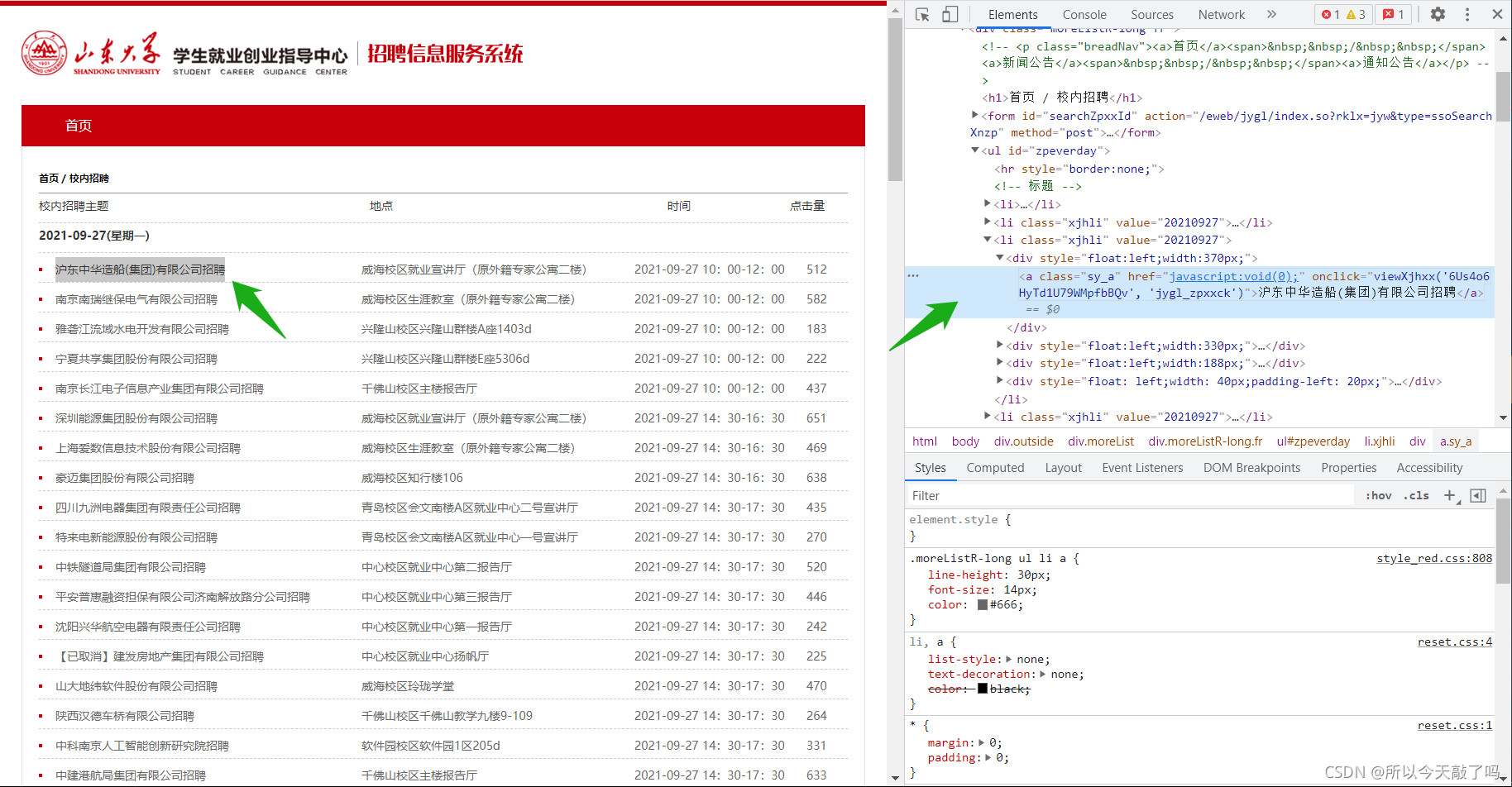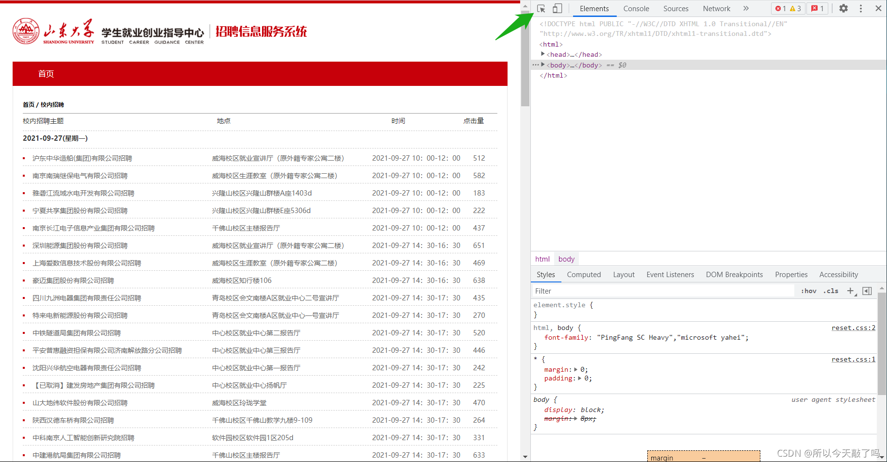 继续按照教程走,在就业网站空白处右键单击,菜单中选择“检查”,网页右侧出现分栏。点击分栏左上角的按钮,图中绿色箭头标出。