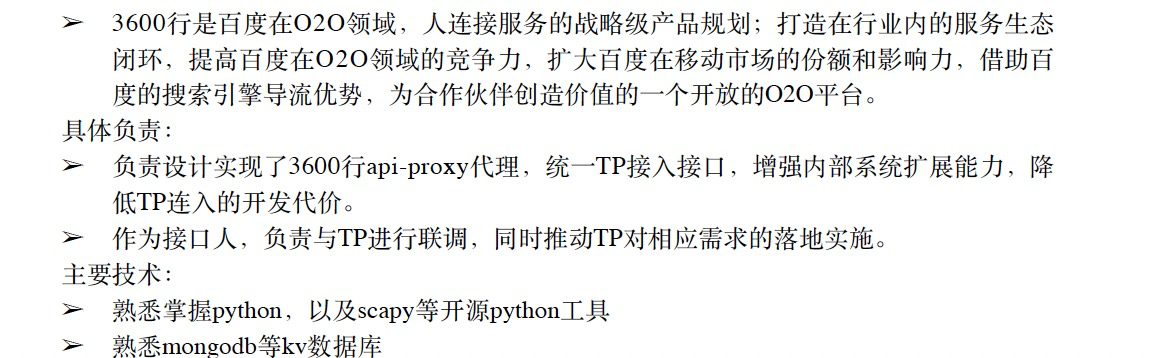 项目经验: 这里的重要点你的项目经验要大概能跟你上面列的技能匹配啊(面试官是希望能看到有实战经验的候选人啊,兄弟们我们去的是公司,没人希望招聘到的是个理论派吧),如果项目技能列一堆比较高级的东西,但是实际的项目经验里面全是些 CRUD的功能小模块系统,没人会相信你真的懂上面的技能的。面试官看到这样的简历,只能pass掉了。这里还有个技巧,先介绍下项目背景,项目背景里面最好有量化的指标,举个例子:
