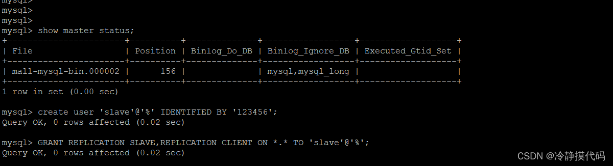 ALTER USER 'slave'@'%' IDENTIFIED WITH mysql_native_password BY '123456';grant replication slave,replication client on *.* to 'slave'@'%';
