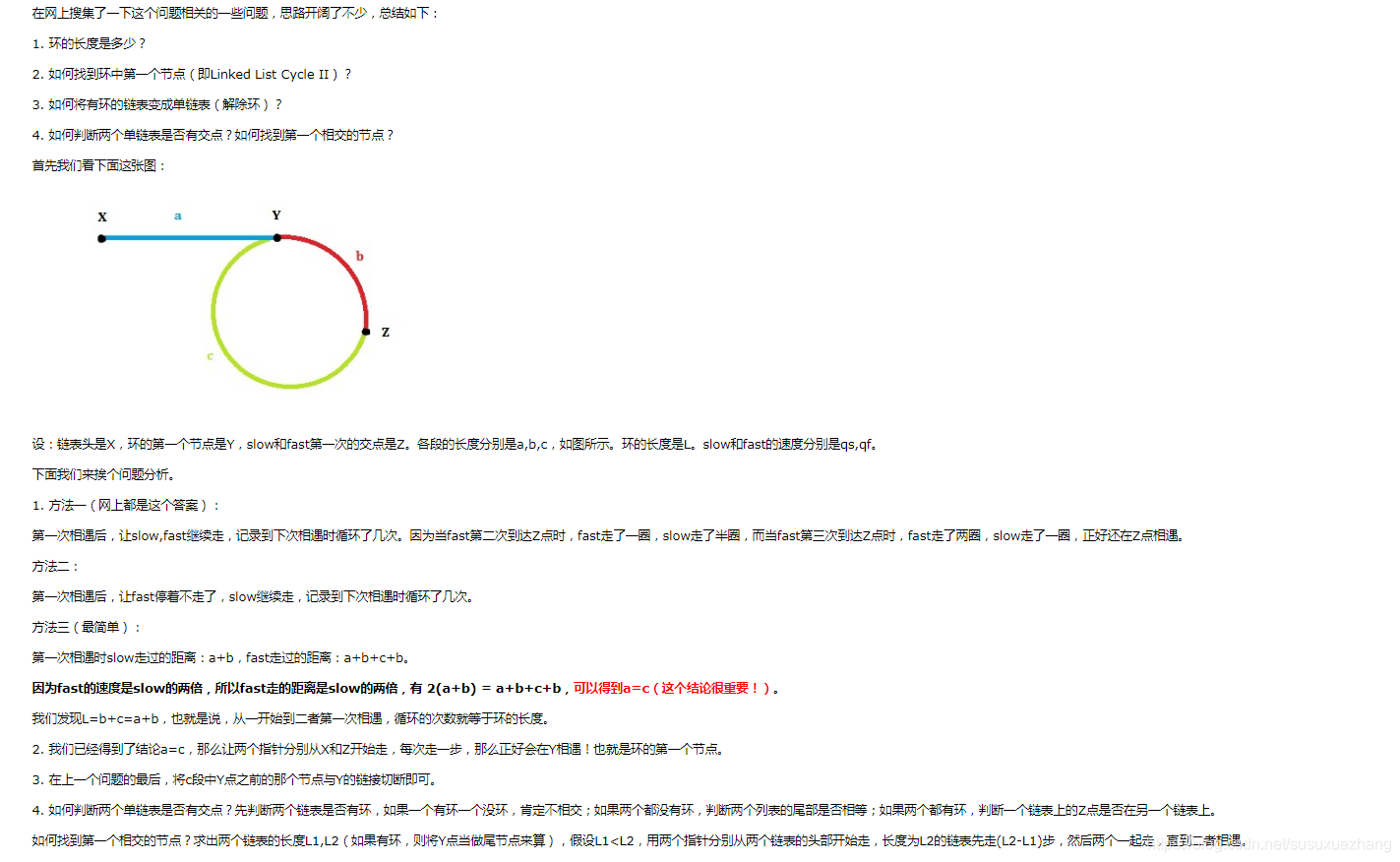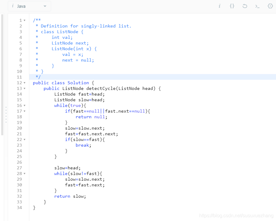 public class Solution {public ListNode detectCycle(ListNode head) {if(head==null||head.next==null){return null;}ListNode slow=head;ListNode fast=head;while(fast!=null && fast.next!=null){slow=slow.next;fast=fast.next.next;if(slow==fast){fast=head;while(slow!=fast){slow=slow.next;fast=fast.next;}return slow;}}return null; }