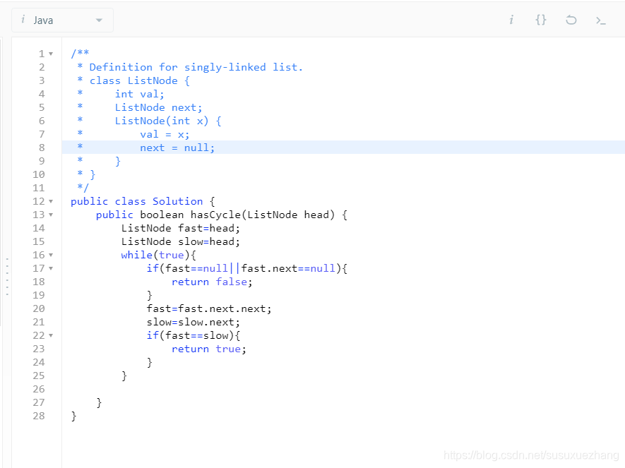 public class Solution {public boolean hasCycle(ListNode head) {if (head == null || head.next == null) {return false;}ListNode slow=head;ListNode fast=head.next;while(fast!=slow){if(fast==null||fast.next==null){return false;}fast=fast.next.next;slow=slow.next;}return true; }