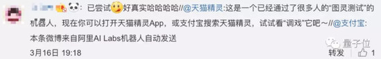 另外,阿里 AI 实验室旗下的“天猫精灵”还表示,这是一个已经通过了很多人的“图灵测试”的机器人,现在就可以打开天猫精灵 App 或支付宝搜索天猫精灵调戏“二哈”了。