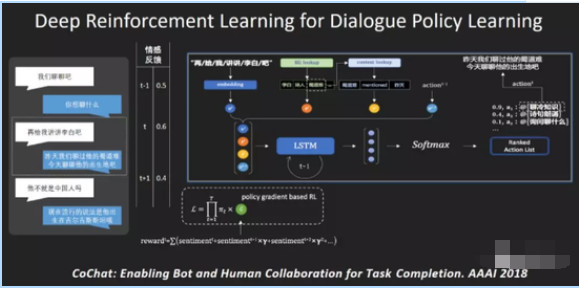 该项挑战非常大,聂再清在 2018 年 AAAI 上有一篇参与发表的论文(CoChat: Enabling Bot and Human Collaboration for Task Completion),核心就是提出一套聊天机器人对话策略学习框架,让“二哈”这样的聊天机器人在不同的场景下都可以持续学习。