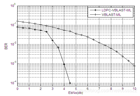 “未加入LDPC码的VBLAST协作MIMO与加入LDPC码的协作MIMO性能比较”图,