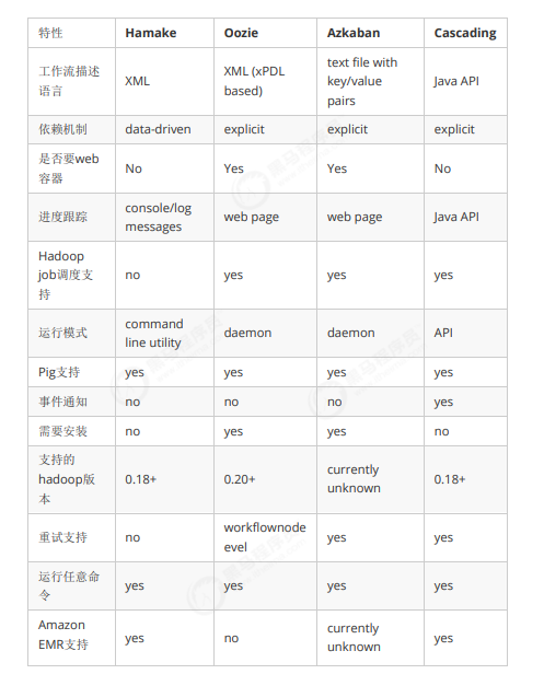 下面的表格对上述四种hadoop工作流调度器的关键特性进行了比较,尽管这些工作流调度器能够解决的需求场景基本一致,但在设计理念,目标用户,应用场景等方面还是存在显著的区别,在做技术选型的时候,可以提供参考。