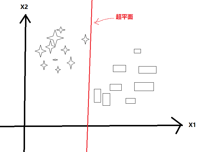 我们先从几何角度上看待SVM算法,首先SVM首次提出是为了解决二分类问题的,比如我们可以画一个平面,横纵坐标为x1,x2。我们在图中表示两个类别,一般情况下,我们需要找到一个线,让这两个类别正确的分割开。我们定义这个线是一个超平面,那么我们模型可以表示为