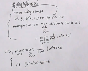 硬间隔SVM,别称是最大间隔分类器。我们从这几个字出发,用数学语言将刚才几何意义表达出来。最大我们用max表示,间隔我们用margin表示,w,t都是相关的,样本点用这样表示: ,约束条件st满足: