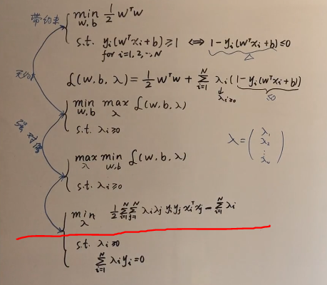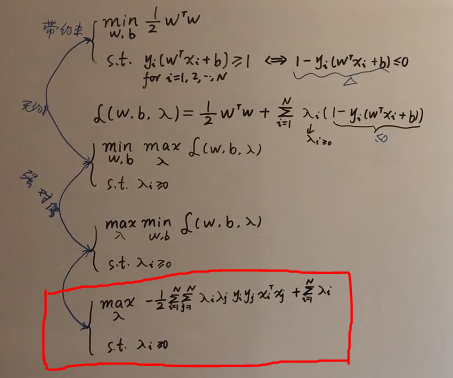 上面我们讲到了怎么对硬间隔SVM进行求解,我们我们先把带约束问题,转化为无约束问题,通过强对偶关系将minmax转为maxmin,对w,b求min,最终我们求出来最小值,然后关于λ求最大值。